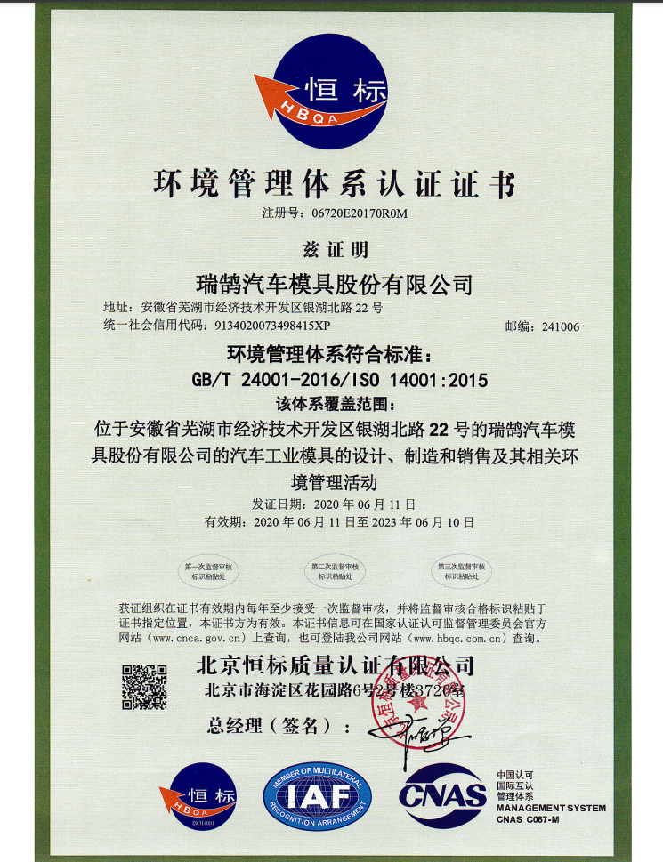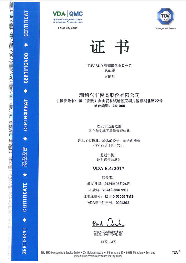 ????????瑞鵠汽車模具股份有限公司成立于2002年3月,坐落于中國(安徽)自由貿易試驗區蕪湖片區銀湖北路 22 號,股本數18360萬,公司的主營業務為汽車沖壓模具、檢具及焊裝自動化生產線的開發、設計、制造和銷售,主要產品有沖壓模具(覆蓋件模具、高強板模具)及檢具、焊裝自動化生產線、一體化鋁壓鑄零部件,為國內少數能夠同時為客戶提供完整的汽車白車身高端制造裝備、智能制造技術及整體解決方案的企業之一。